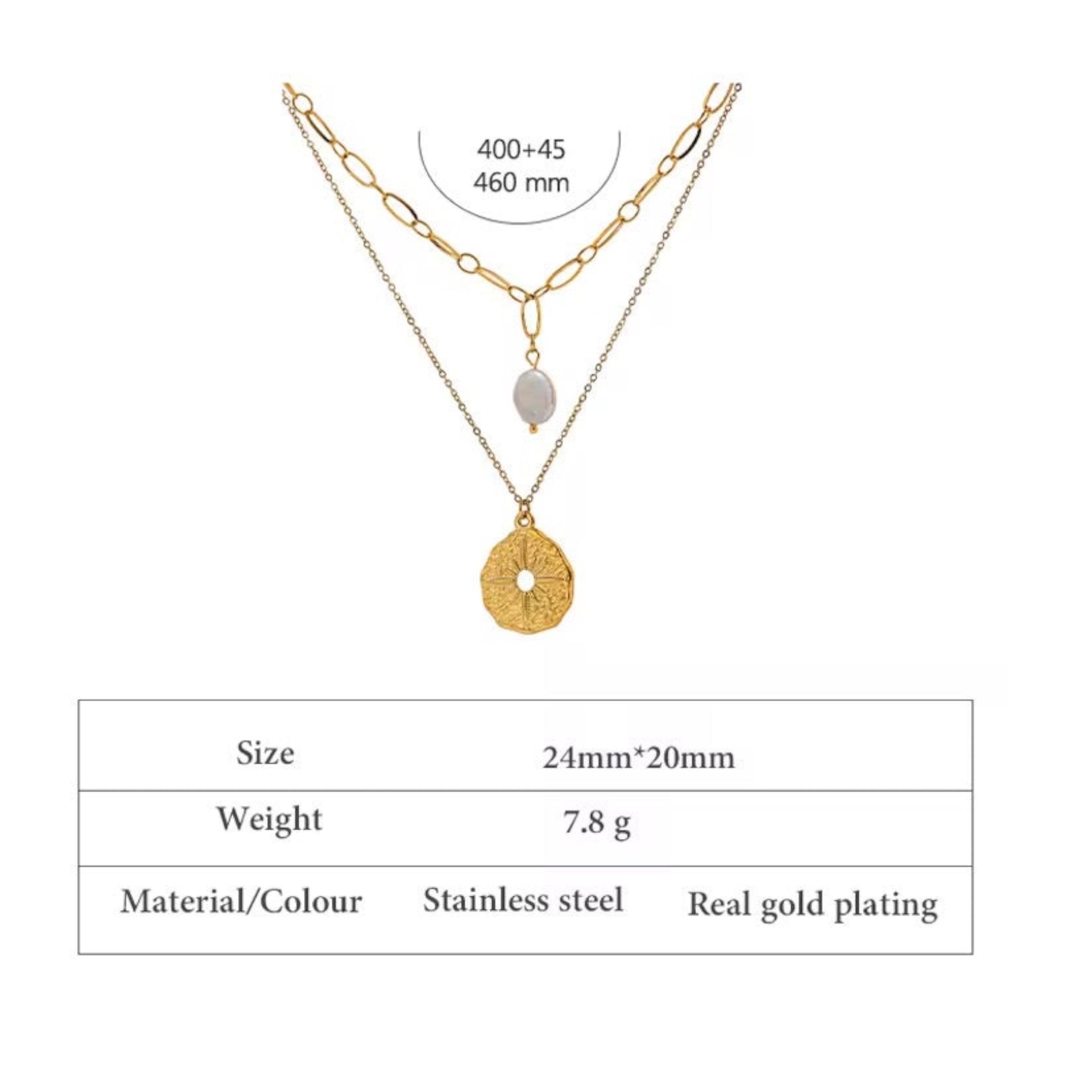Definition of effortless polish: medallion pendant, natural pearl accent, and sleek chainwork, all in one bold, balanced piece.